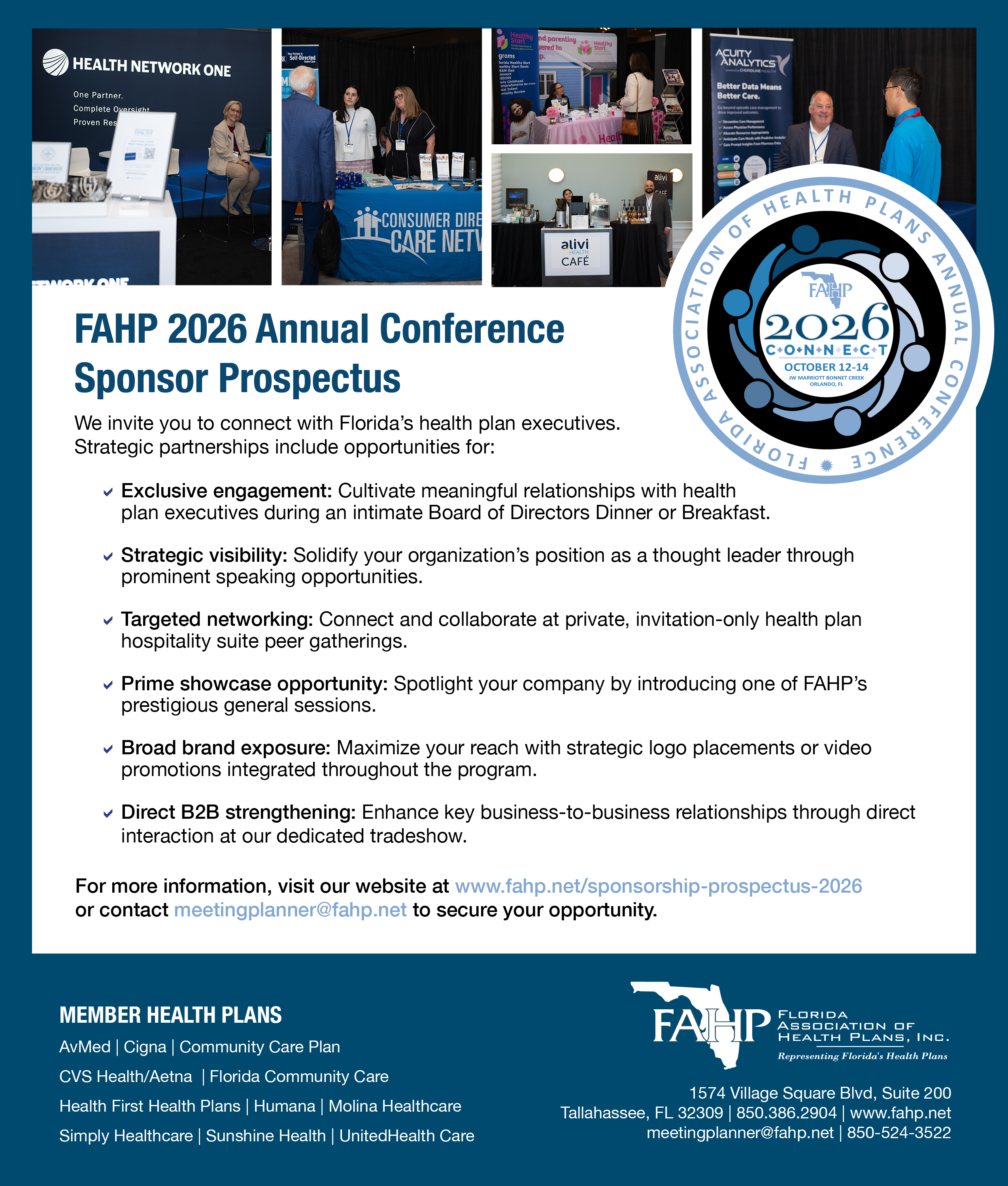 About UsThe Florida Association of Health Plans (FAHP) is the statewide trade association representing commercial, Medicaid and Medicare Advantage health insurers and managed care organizations. FAHP members provide access to health care benefits and services to businesses, individuals and families across the state of Florida. FAHP advocates for public policy focused on enhancing access to high quality, affordable health care through a competitive marketplace. Our mission is to improve and protect the health and financial security of Florida families and business community. We do this by: 1. Developing cooperative relationships between health plans, community and provider stakeholders, as well as government partners. FAHP 2026 Annual Conference: More information coming soon!